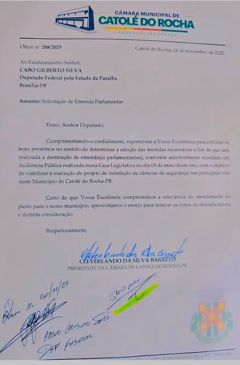 Foi publicado nas redes sociais do vereador Cleverlando Barreto, no dia 18 de dezembro 2025, que o deputado federal Cabo Gilberto Silva (PL-PB) destinou a quantia de R$ 500 mil reais em emenda parlamentar de sua autoria para aquisição e instalação de câmeras de monitoramento de segurança pública no município de Catolé do Rocha, no Sertão paraibano. O recurso atende solicitação direta do grupo Direita Catolé endossada pelo vereador Cleverlando Barreto (União Brasil), presidente da Câmara Municipal, juntamente com o civil Ronaldo Pedro, integrante da Direita Catolé, e principal articulador da demanda junto ao parlamentar.