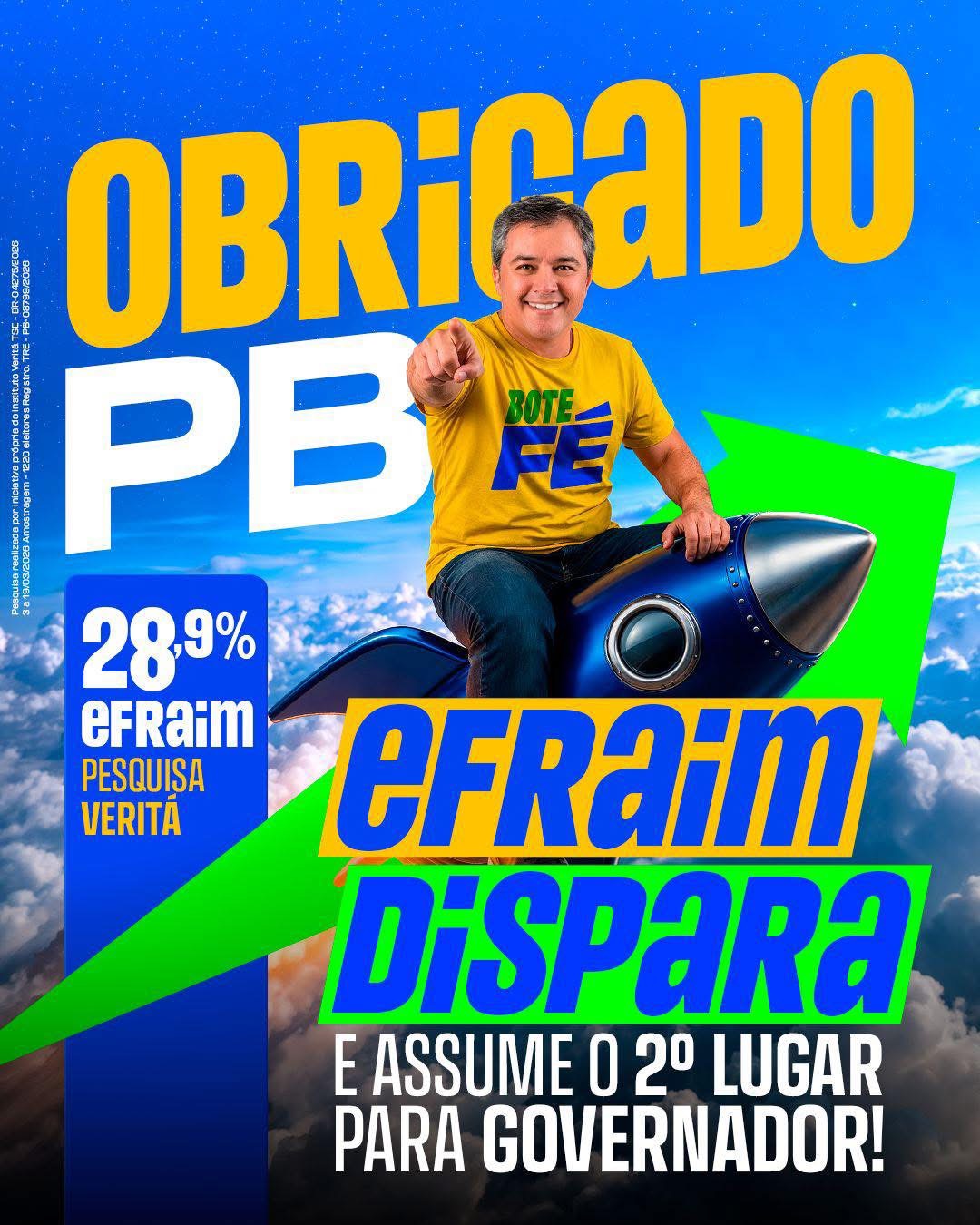 Com a subida do terceiro para o segundo lugar, Efraim consolida seu nome como um dos protagonistas da disputa rumo ao governo da Paraíba e reforça o caminho para o segundo turno, impulsionando ainda mais uma candidatura que segue em ritmo acelerado e em franca ascensão no estado.
