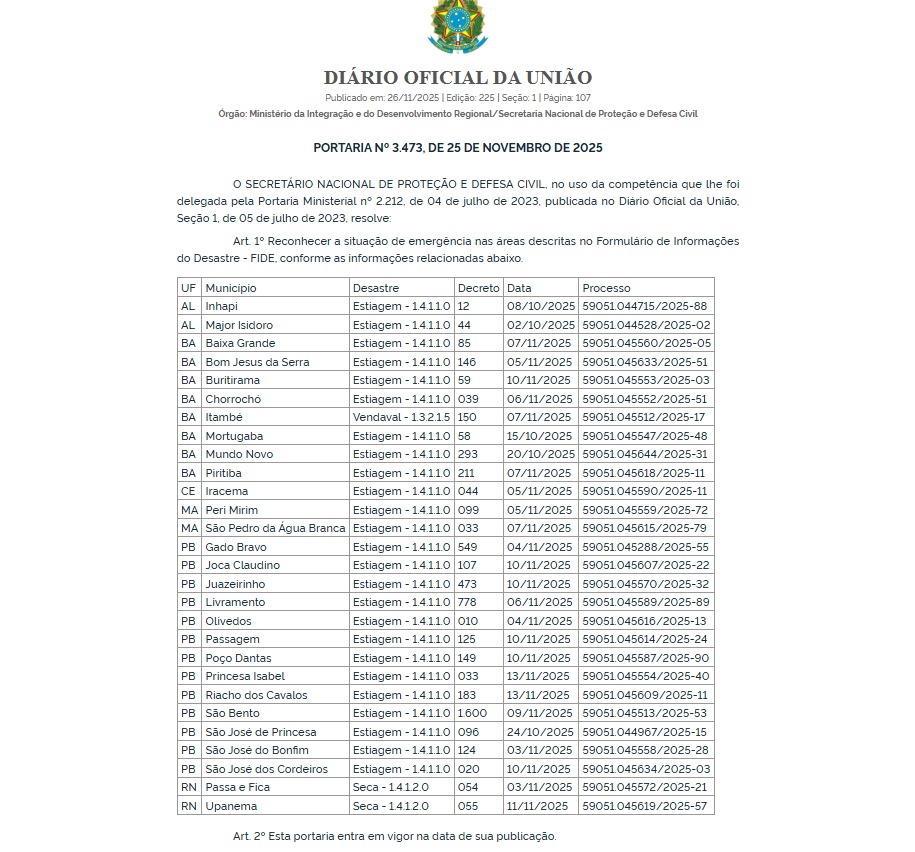O Ministério da Integração e do Desenvolvimento Regional e a Secretaria Nacional de Proteção e Defesa Civil reconheceram situação de emergência por estiagem em 13 municípios da Paraíba. Portaria assinada por Wolnei Wolff Barreiros, secretário da Defesa Civil, foi publicada no Diário Oficial da União (DOU) desta quarta-feira (26).