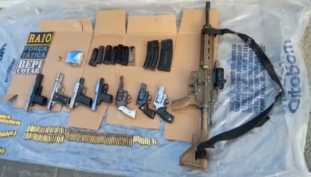Com o bando, os policiais apreenderam oito armas de fogo, sendo um fuzil, quatro pistolas, três revólveres, além de mais de 150 munições e drogas.