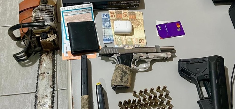 Durante a ação, os policiais apreenderam uma pistola, carregadores, roupas táticas e outros objetos bélicos, incluindo a coroa de um fuzil AR-15.
