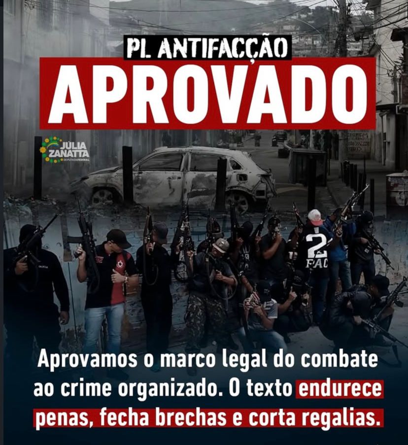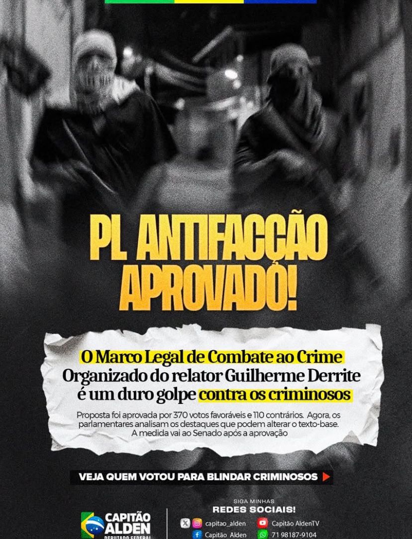 Com a aprovação na Câmara, o PL segue agora para o Senado, onde deve receber tramitação célere. A sociedade brasileira, cansada de ver territórios dominados por facções e famílias reféns do medo, finalmente vê a luz no fim do túnel. Parabéns ao deputado Guilherme Derrite por sua relatoria corajosa e técnica – um verdadeiro marco na segurança pública do país!